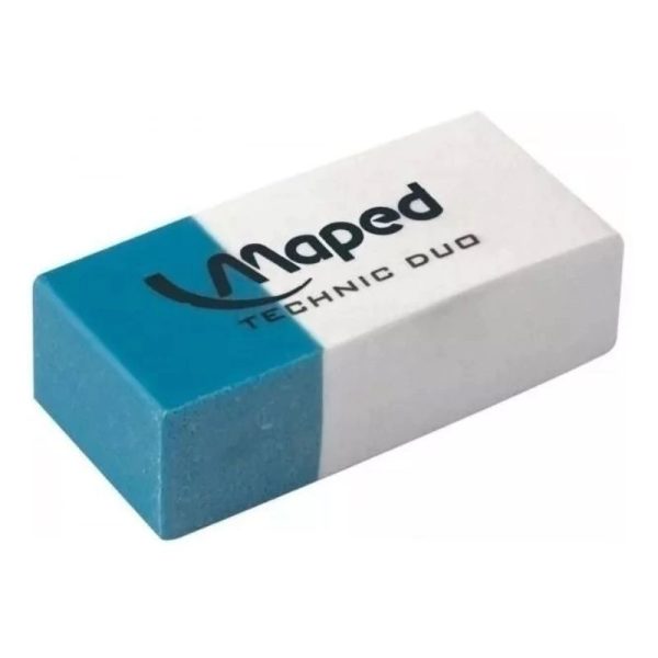 Goma de borrar Maped Technic Duo 511710, combinada para lápiz y tinta. Borra eficazmente ambos tipos de trazo sin dejar residuos. Cuerpo dividido en dos colores para fácil identificación.