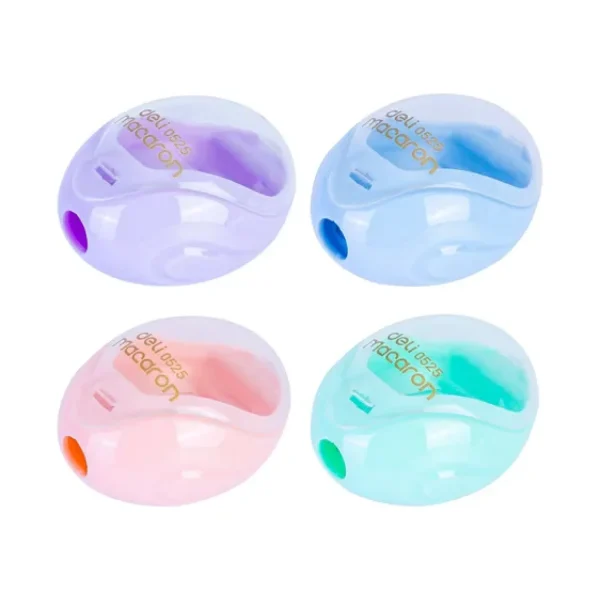 Sacapuntas de diseño compacto en tonos pastel, con depósito integrado para residuos. Ideal para uso escolar o de oficina.
