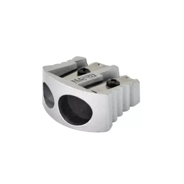 Sacapuntas metálico de 2 orificios, en cuerpo de aluminio resistente, ideal para lápices finos y gruesos.